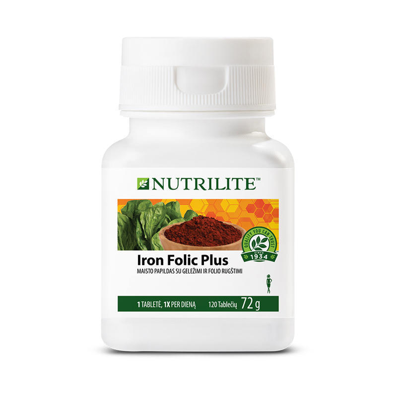 Nutrilite Iron Folic Plus aprūpina geležimi iš dviejų šaltinių kartu su folio rūgštimi. Kasdieninėje Jūsų mityboje gali trūkti pakankamo šių maistingųjų medžiagų kiekio, jeigu valgote nesubalansuotą maistą. Pasidėjęs poreikis atsiranda nėštumo ir maitinimo krūtimi metu. Šiame produkte taip pat yra aukščiausios kokybės Nutrilite™ Spinach Concentrate špinatų koncentrato.